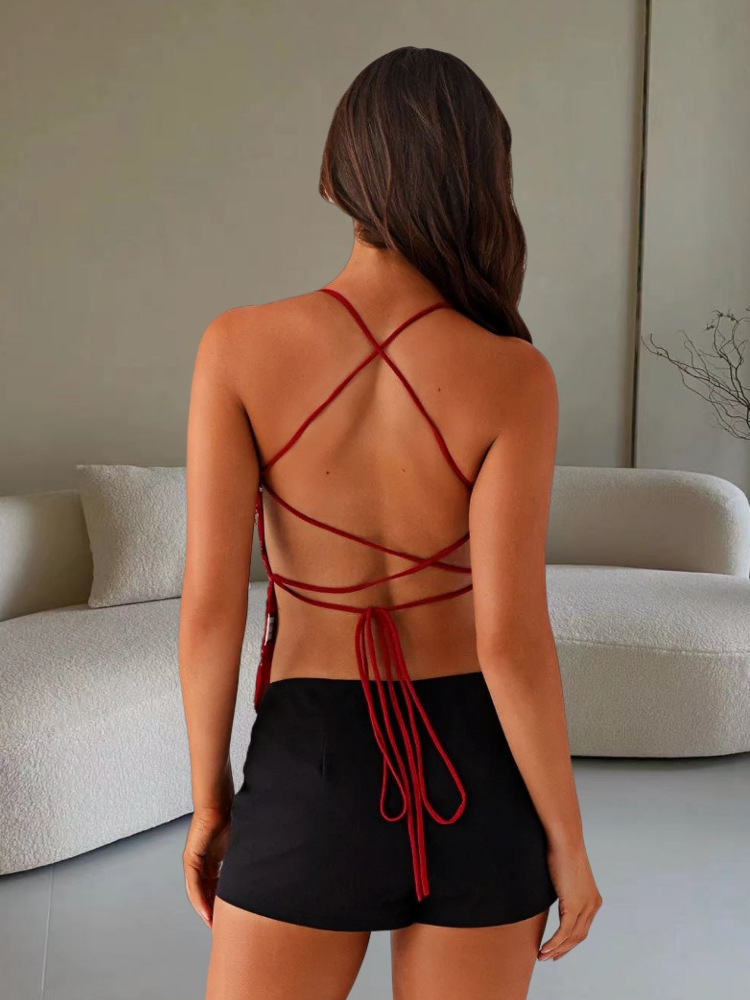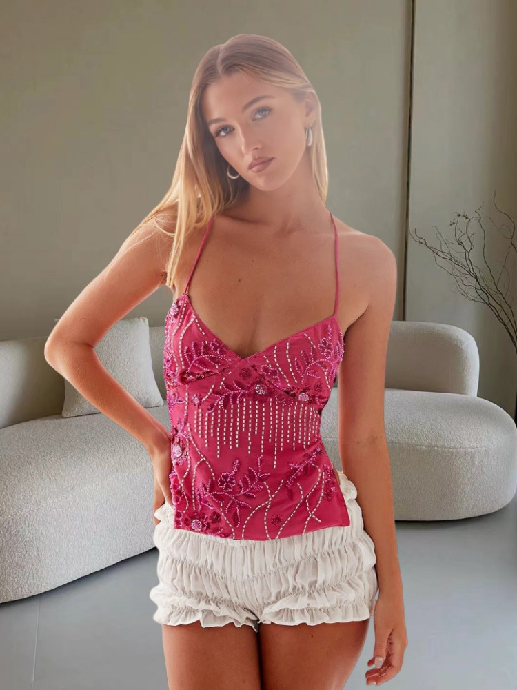• Y2K Dopamine-colored Bandeau Sling Tops Summer V-neck Flower Beaded Backless Vest For Women